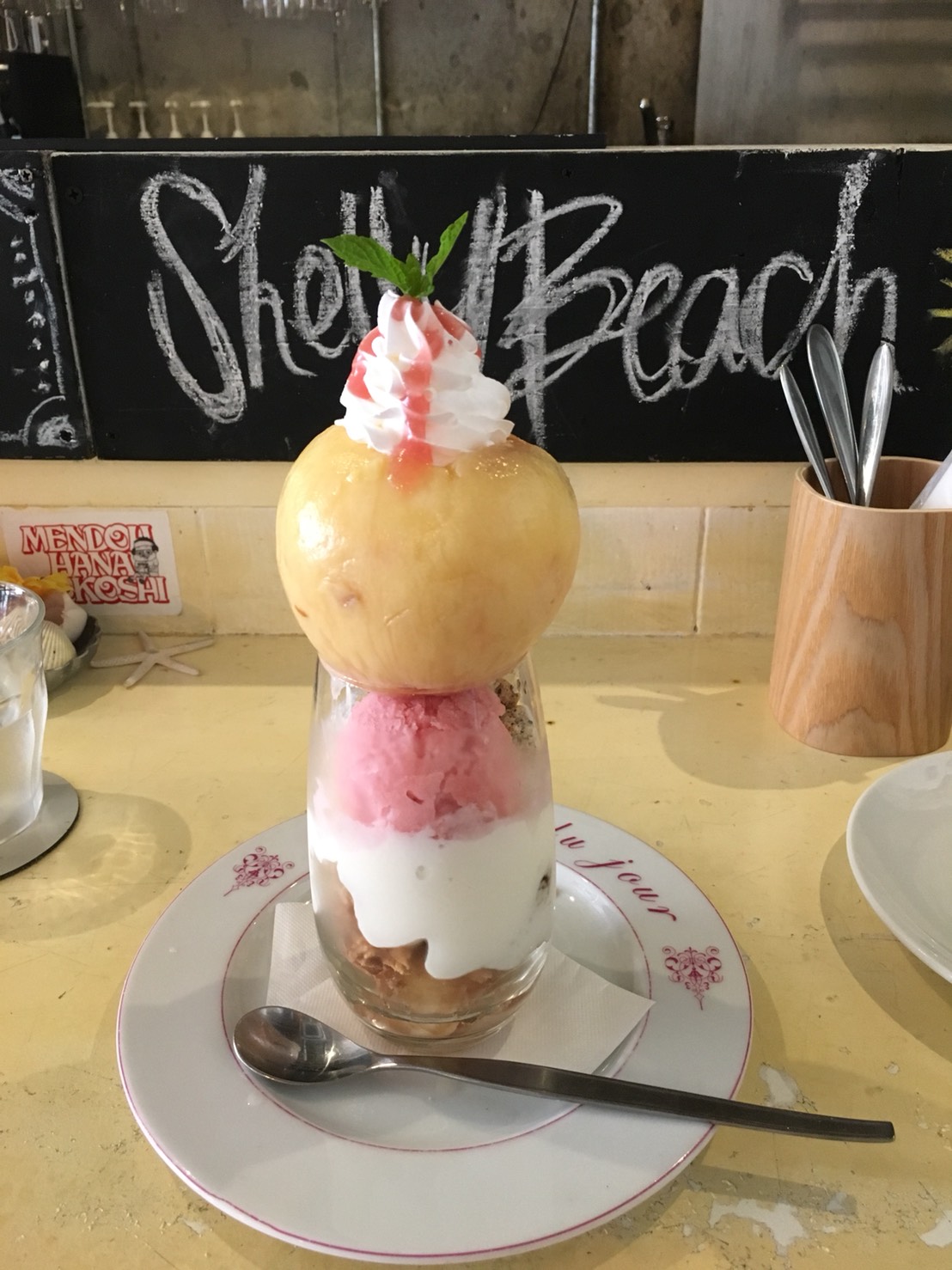シェリービーチ福岡 桃の中にカスタードクリームが入っていて、桃のアイスとアールグレイのクッキー、杏仁豆腐、グラノーラ、ナッツが下にははいってました(パフェ) 8月いっぱいのスイーツです🍑 博多駅こころ歯科クリニック スタッフ M